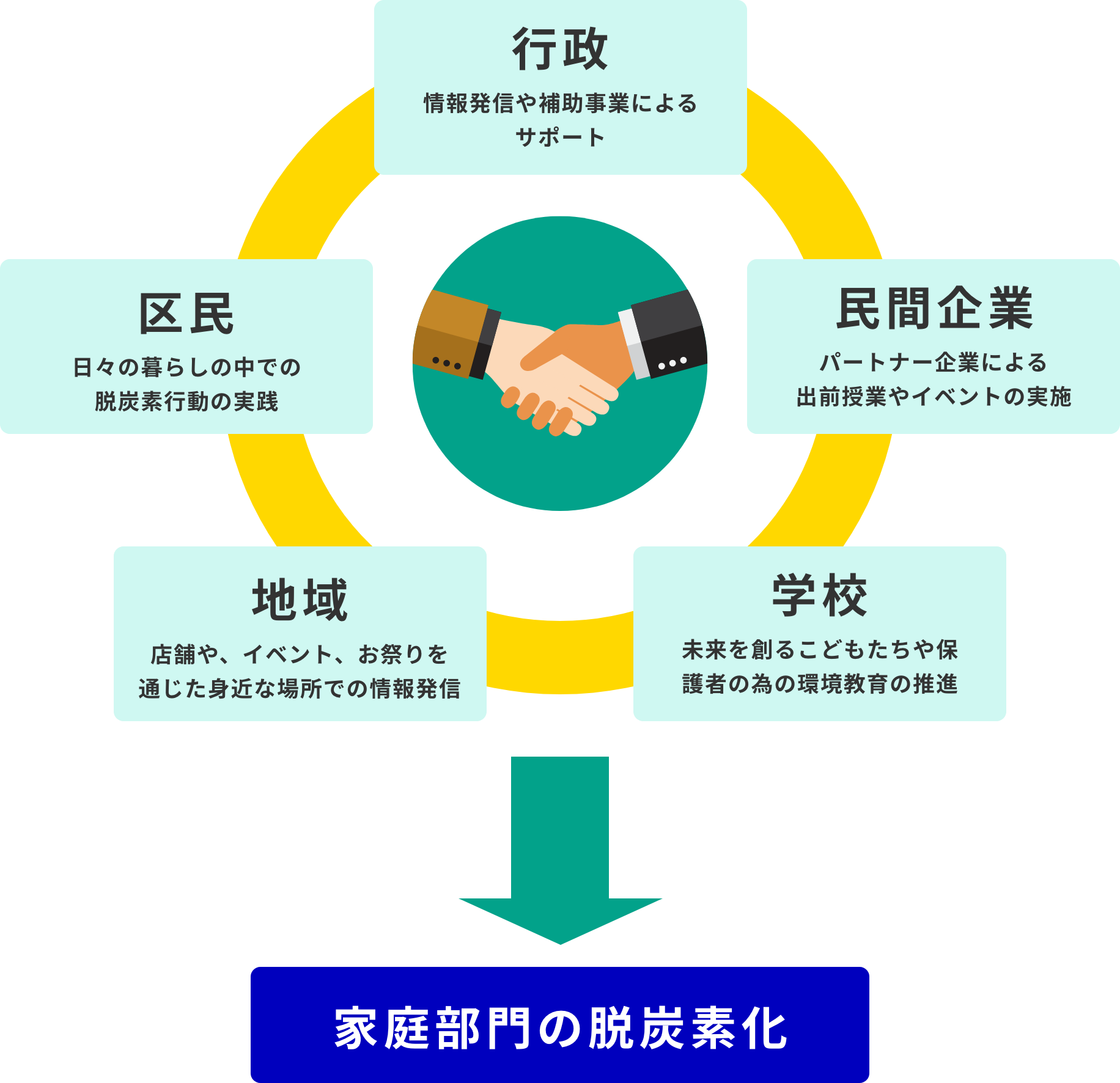 UCHIKARAでは、本目標達成に向けて区民・事業者・区の連携・協働により、エネルギーの効率的な利用や再生可能エネルギーの利用拡大などの取組みを推進し、区民一人ひとりの豊かな暮らしと二酸化炭素排出量の削減が両立される持続可能な未来を目指していきます。