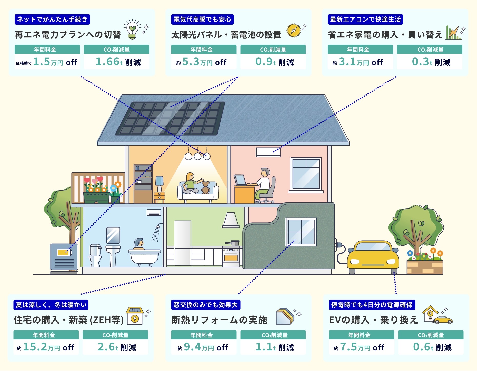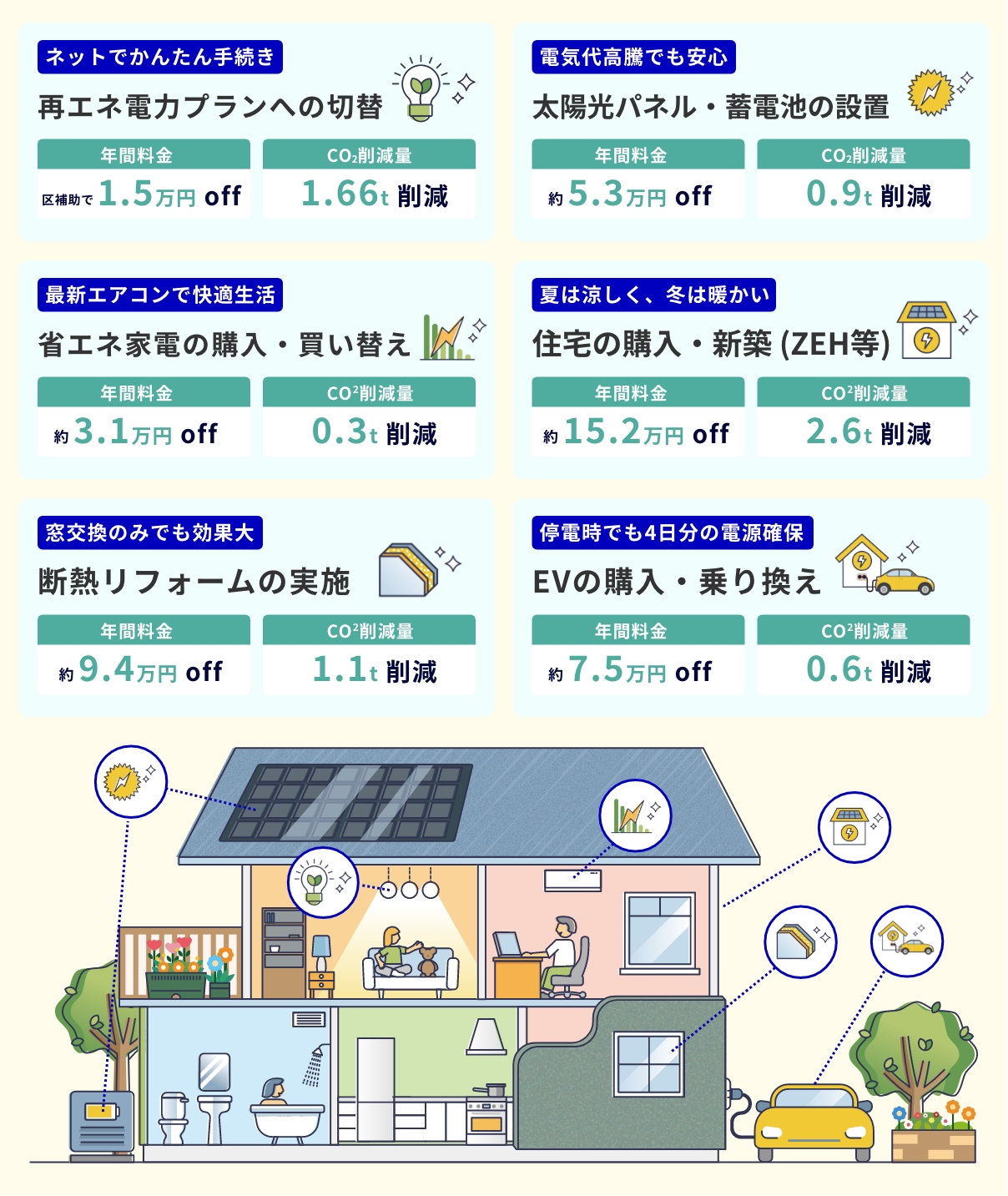 冬は暖かく夏は涼しい快適な暮らしを実現しながら、光熱費とCO2を同時に削減できる、家計にも地球にも優しいアクションです。